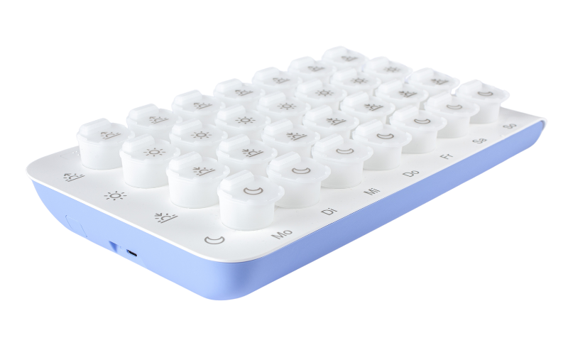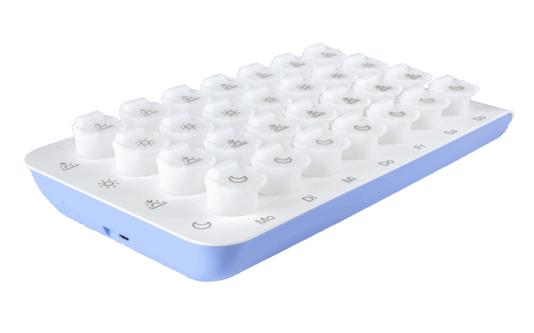 Die smarte Medikamentenbox erinnert Patienten an die Einnahme zum richtigen Zeitpunkt und informiert Angehörige jederzeit und an jedem Ort.